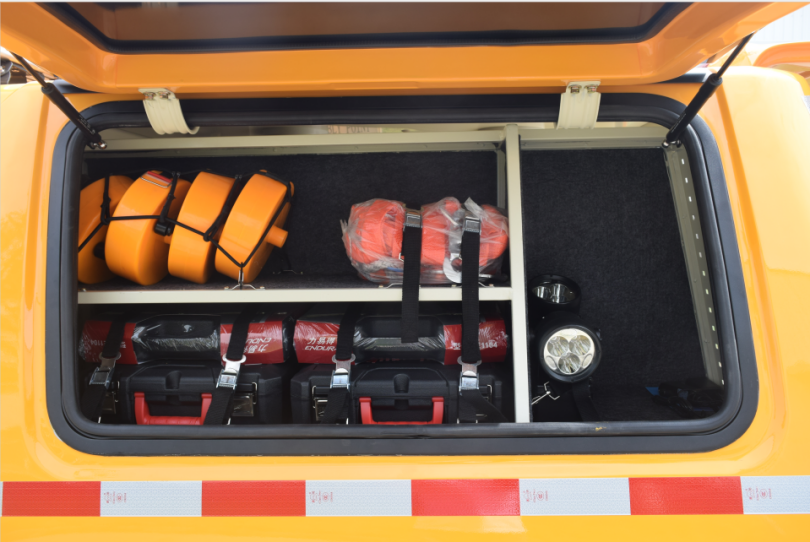 左右对称狭小空间,可放置全身式安全带,照明灯具,小型配件盒(铜鼻子,熔丝等),货架底部有绒布或黑色绝缘皮,对设备进行缓冲。设备用强力扎带扎紧,防止设备在车辆行驶过程中装撞击损坏。